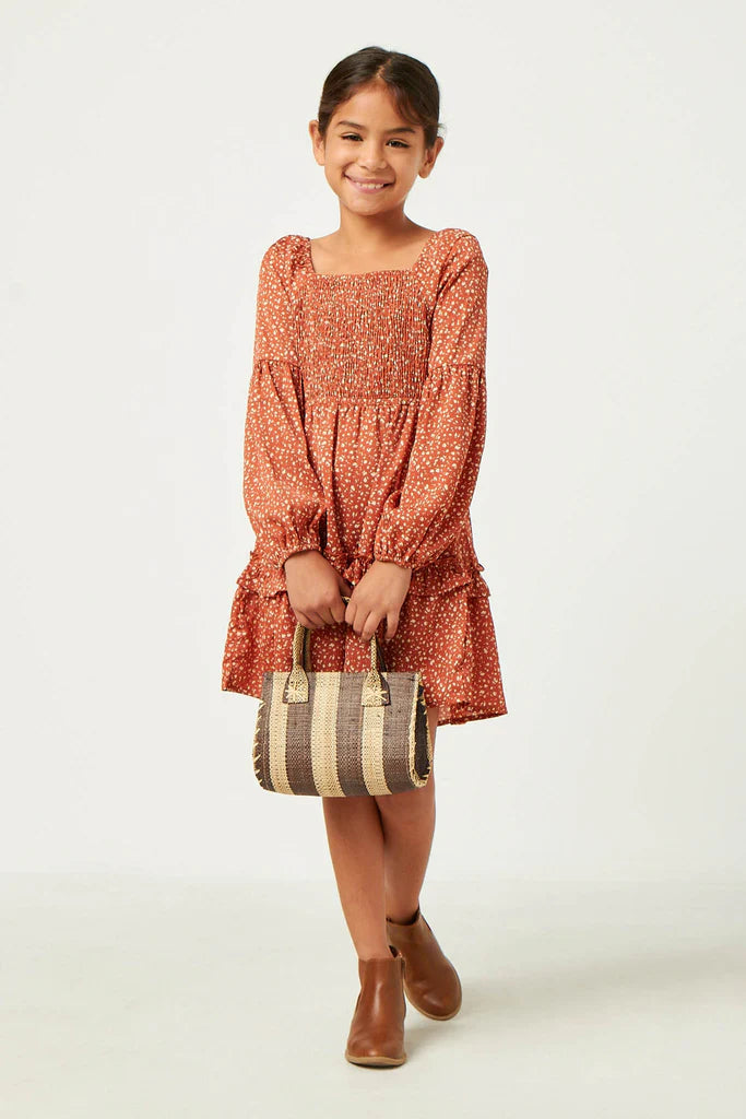 Girls Smocked Bodice Puff Sleeve Ruffled Dress